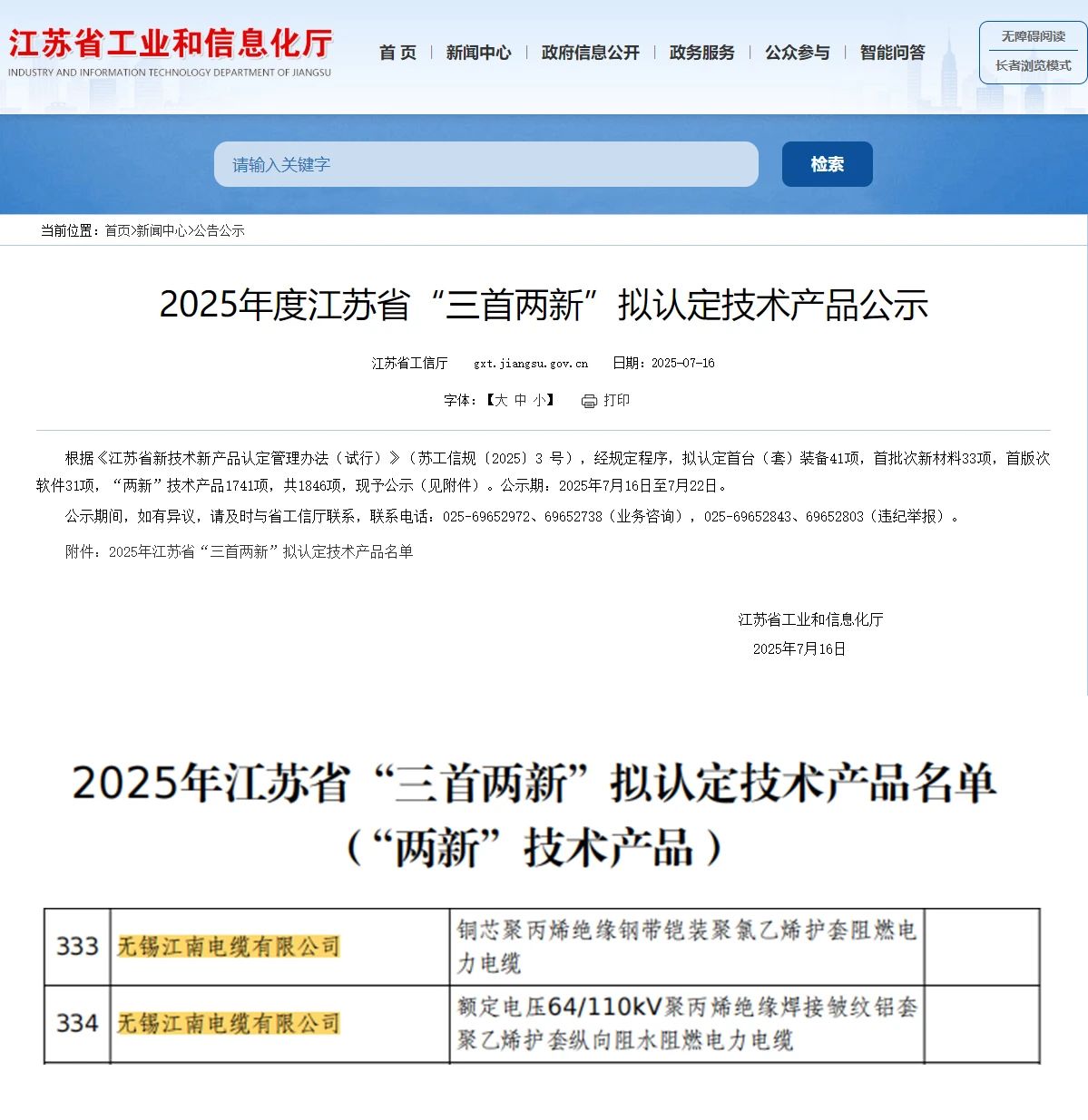 近日,江蘇省工信廳公示2025年度江蘇省“三首兩新”擬認定技術(shù)產(chǎn)品名單,無錫江南電纜有限公司“銅芯聚丙烯絕緣鋼帶鎧裝聚氯乙烯護套阻燃電力電纜”和“額定電壓64/110kV聚丙烯絕緣焊接皺紋鋁套聚乙烯護套縱向阻水阻燃電力電纜”被認定為“兩新”技術(shù)產(chǎn)品。